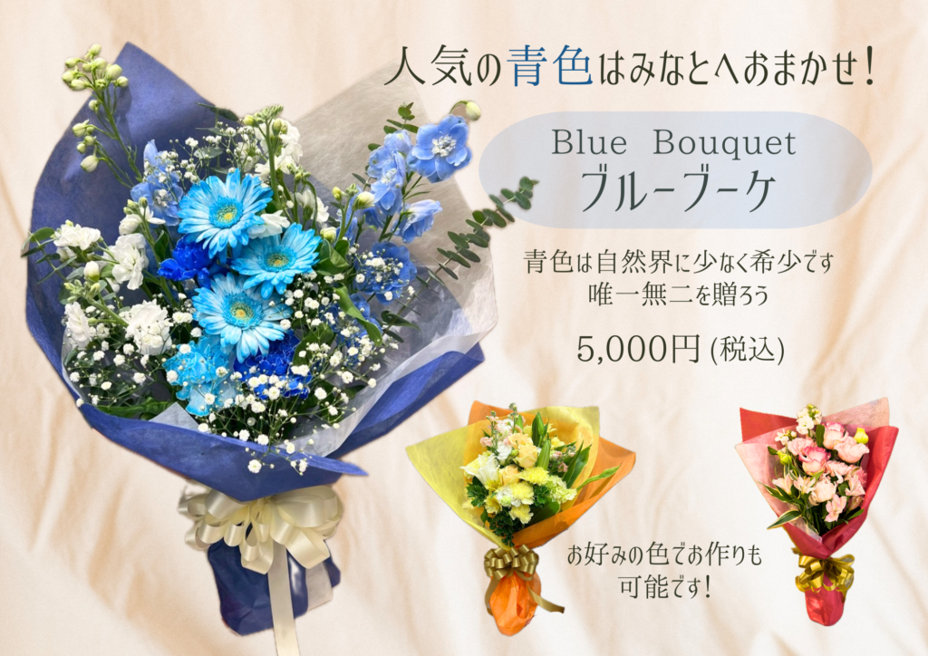 自然界に少ない青色の花。染めの技術を駆使した美しいお花や天然の青色のお花をたくさんご用意しています。ご予算に合わせてお作りいたします!